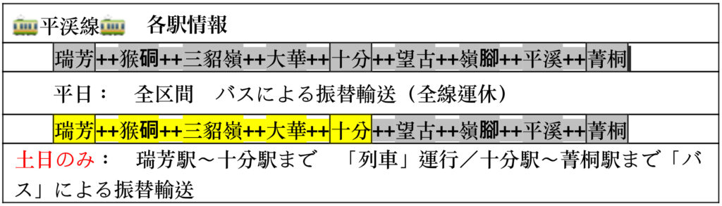 (1)平日……全線代行運行バスの停車駅:「瑞芳」、「十分」、「望古」、「嶺脚」、「平渓」、「菁桐」 間を折り返し運転